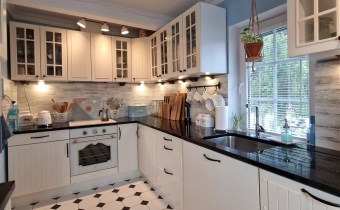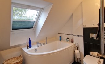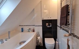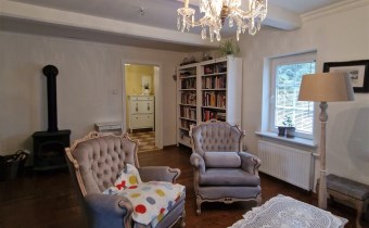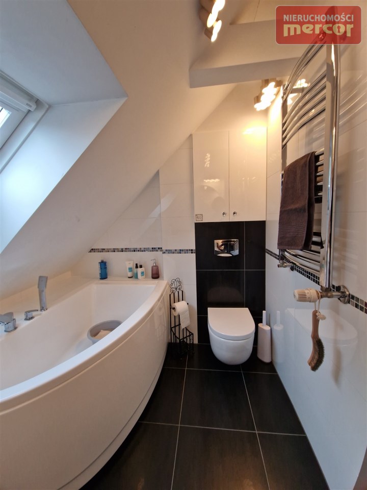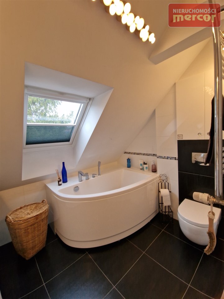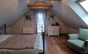 Salon z kominkiem, osobna kuchnia, pokój gościnny z gabinetem, pomieszczenie gospodarcze, łazienka z kabiną i WC. 2. Piętro składa się z: