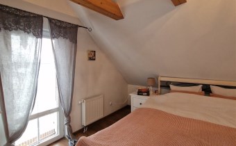 -dwie sypialnie, garderoba, łazienka z wanną i toaletą. Pomieszczenia łączy hall wewnętrzny z wejściem na balkon.