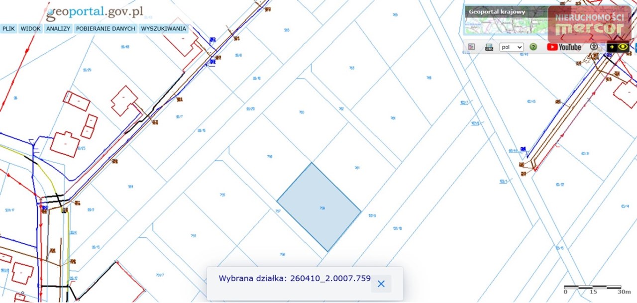 Działka nr 759 o regularnym kształcie prostokąta, nieogrodzona i niezagospodarowana.