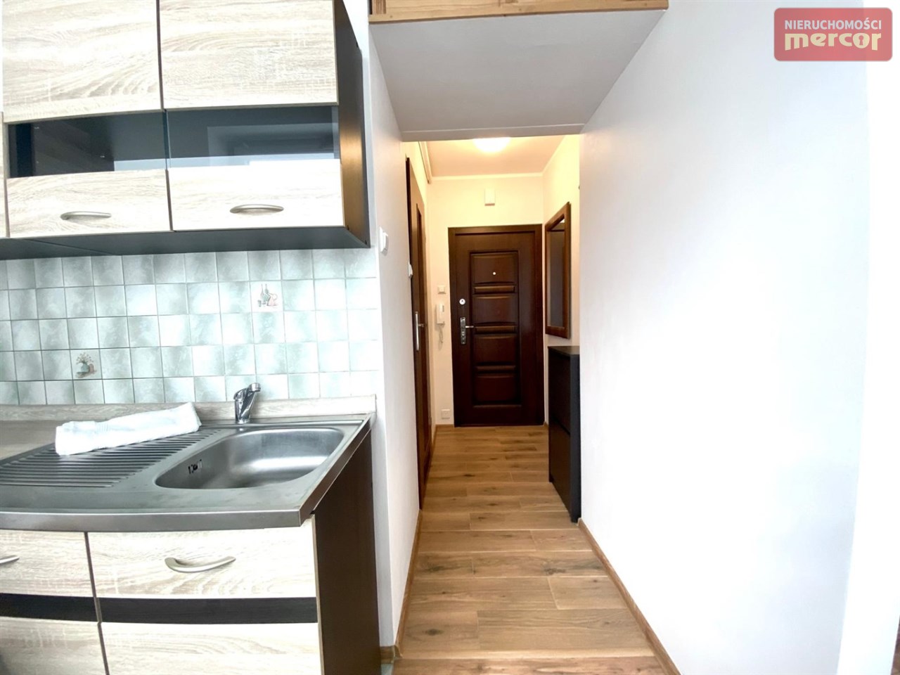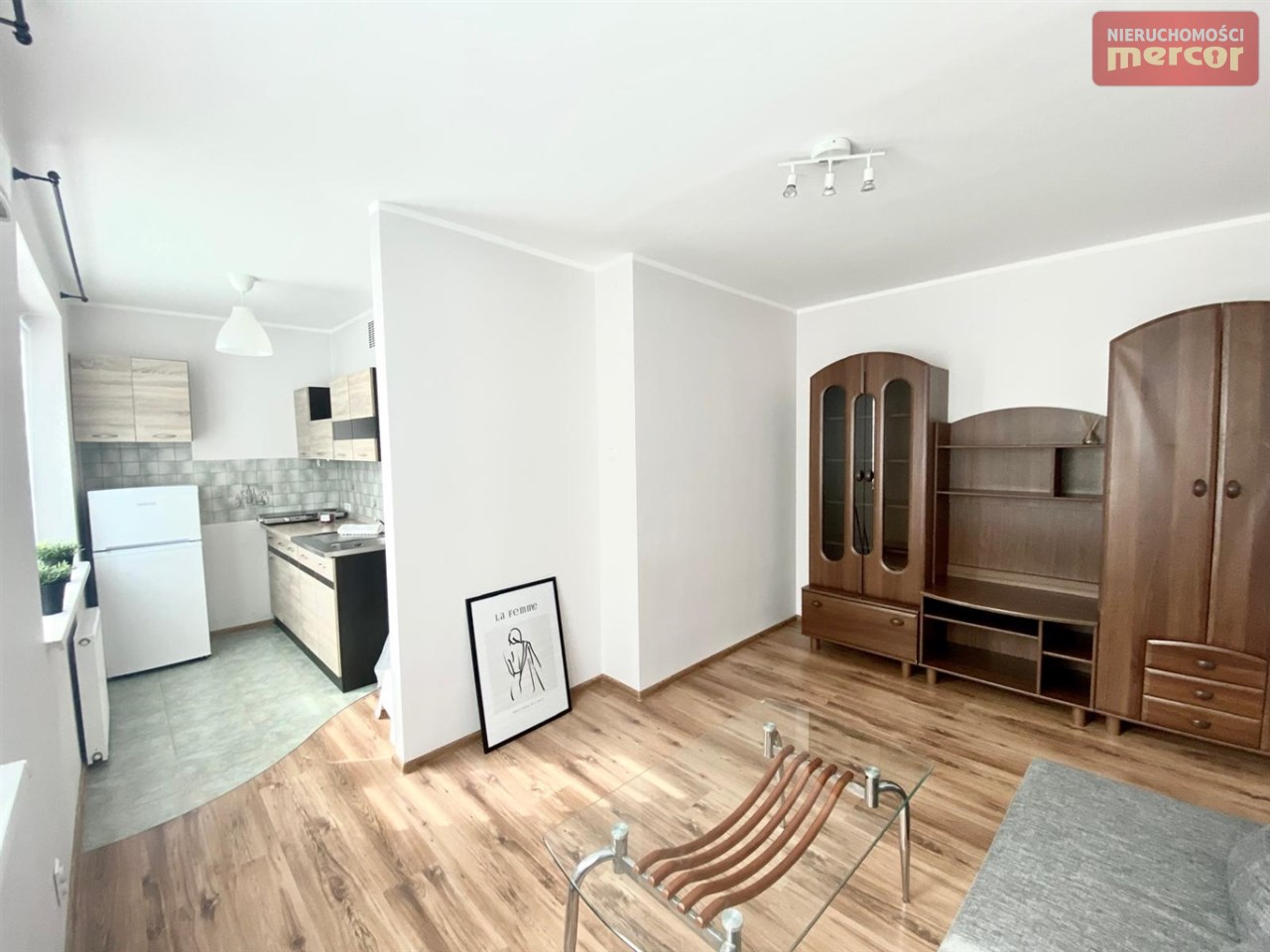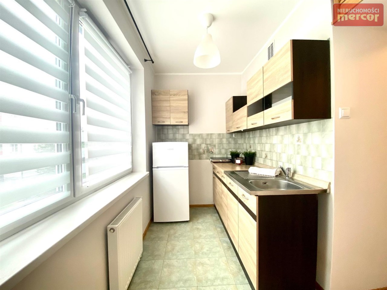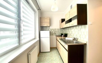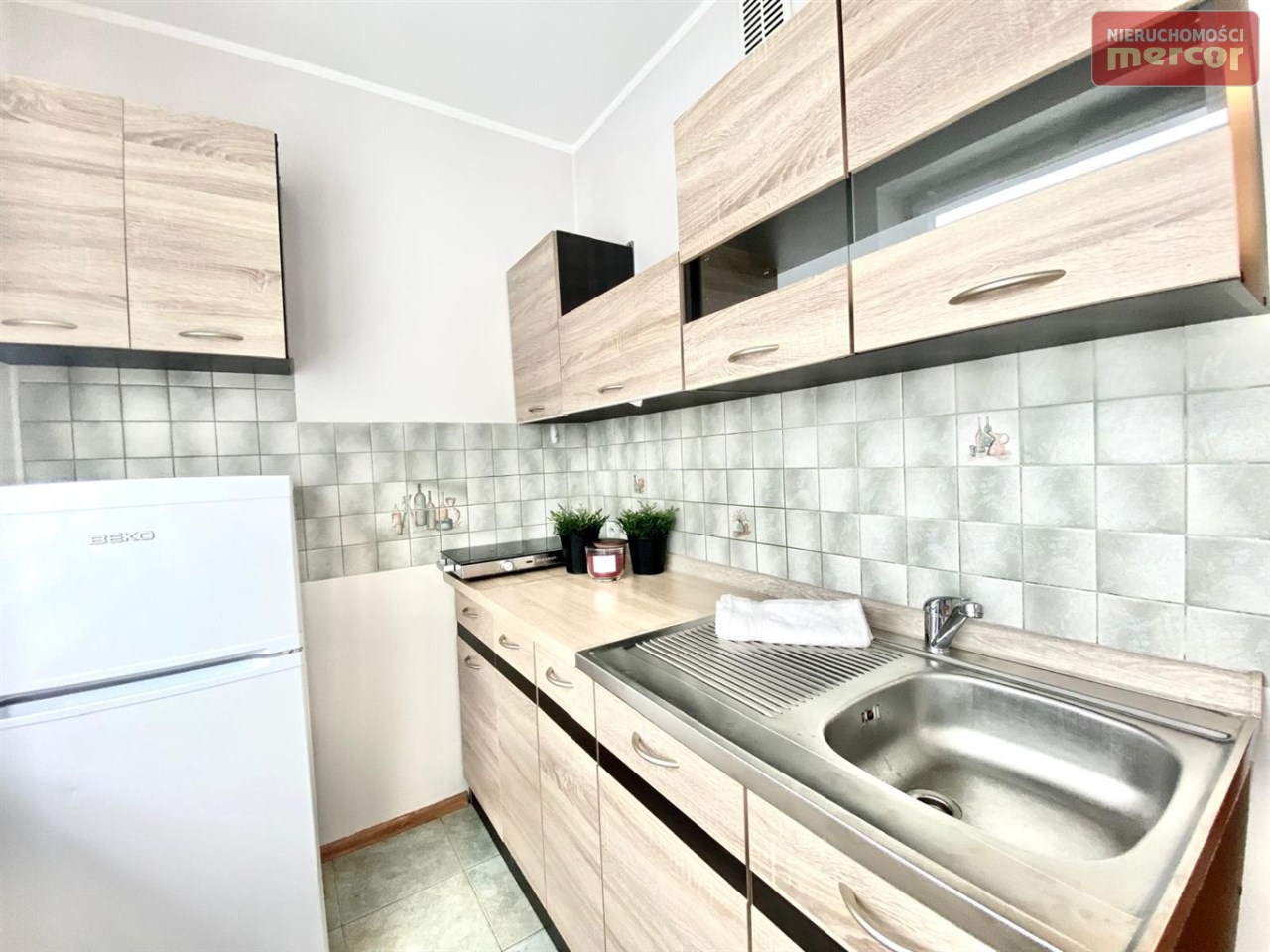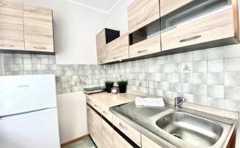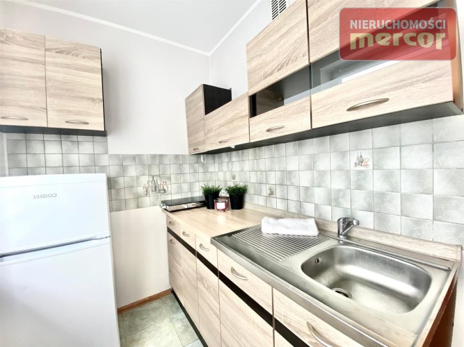 W kuchni: szafki stojące i wiszące, płyta elektryczna 2 palnikowa, lodówka(Beko), zlewozmywak z baterią.
