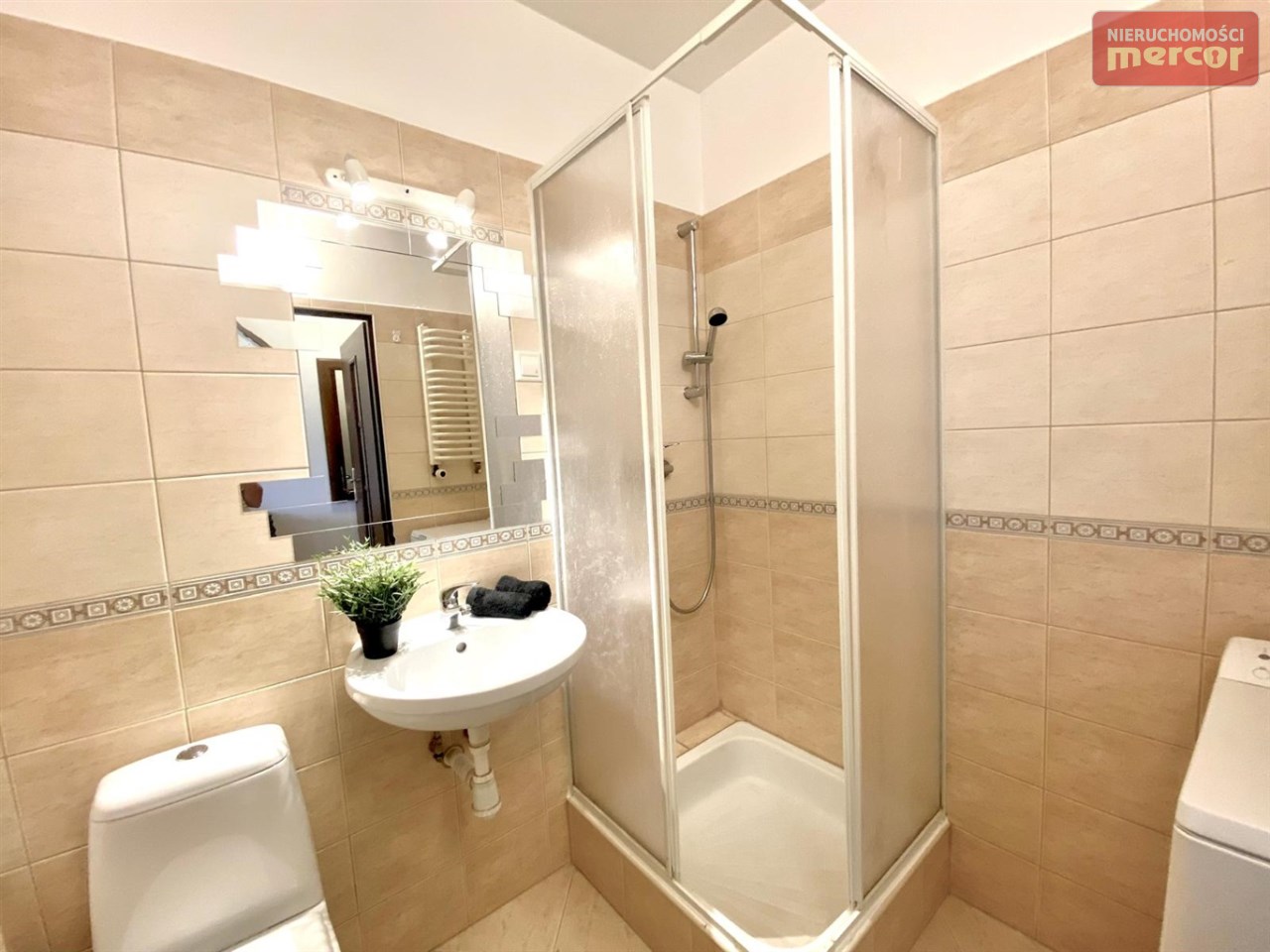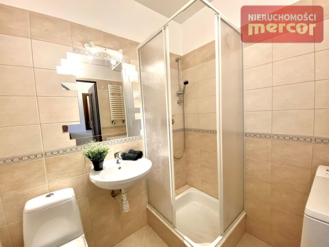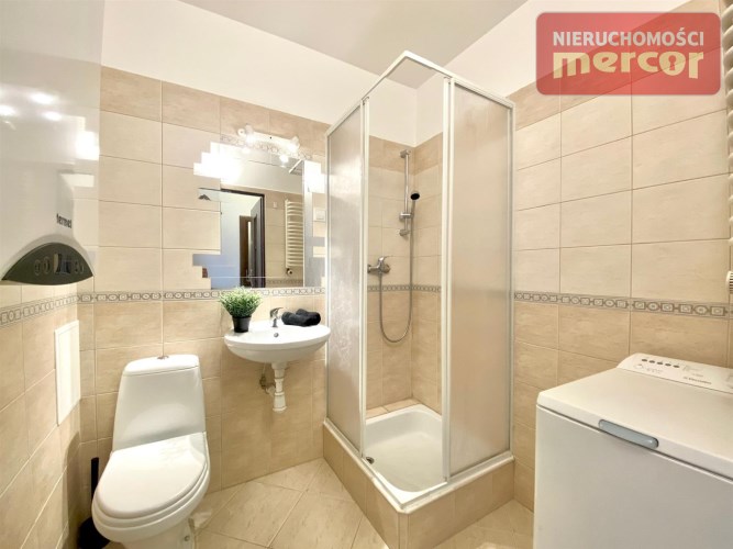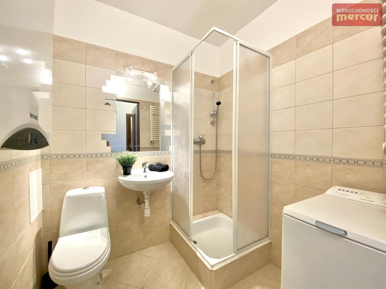 W łazience z WC : kabina prysznicowa, umywalka, toaleta, pralka(Electrolux), lustro, piec gazowy dwufunkcyjny (2 letni)