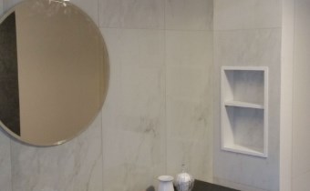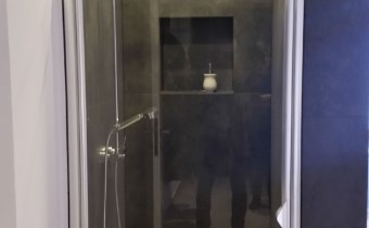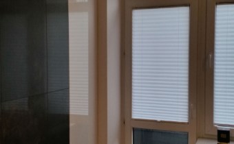 W części kuchennej meble w zabudowie, na ścianach glazura i gładź.