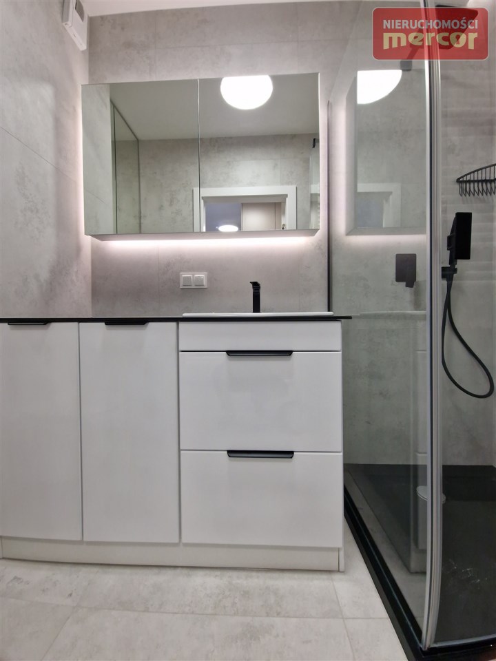 Mieszkanie wykończone i wyposażone. W pokojach na podłogach panele najwyższej jakości, na ścianach gładzie gipsowe. W części kuchennej na podłodze gres. Energooszczędne porządne trzy szybowe okna. Oświetlenie energooszczędne typu LED.